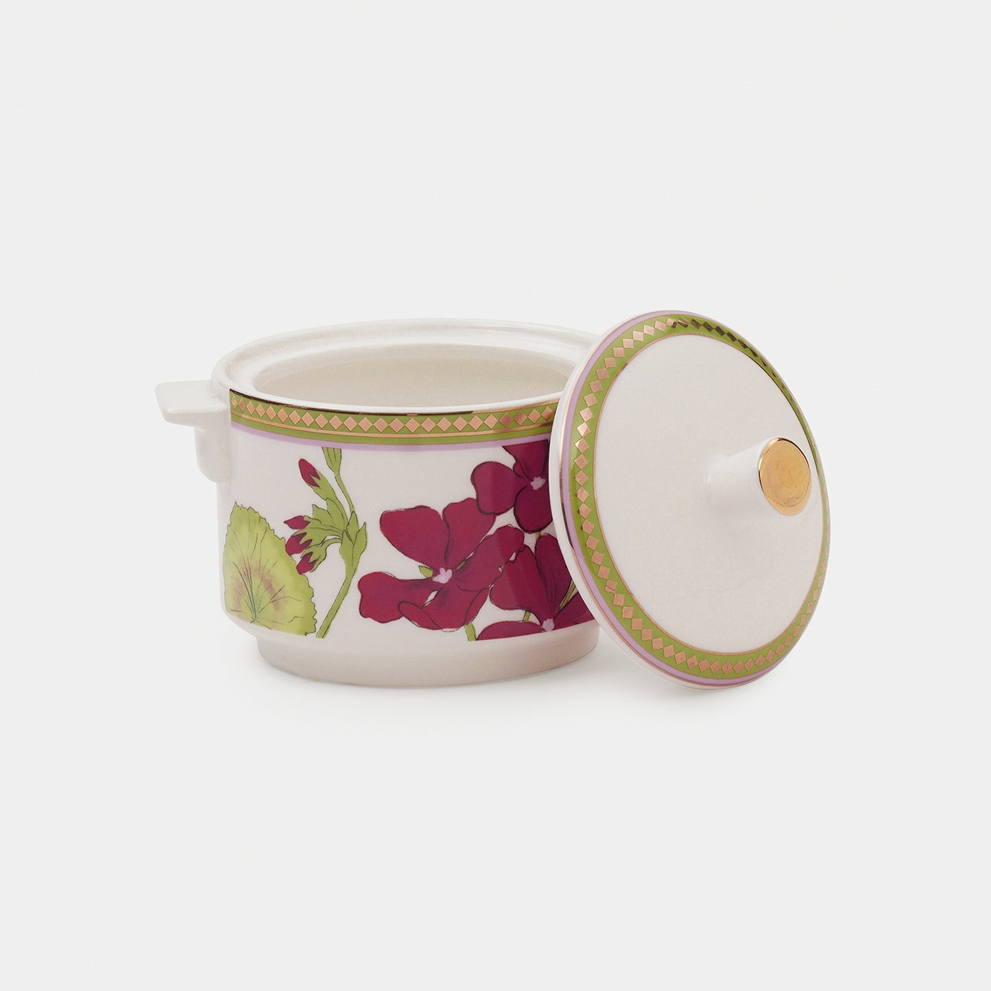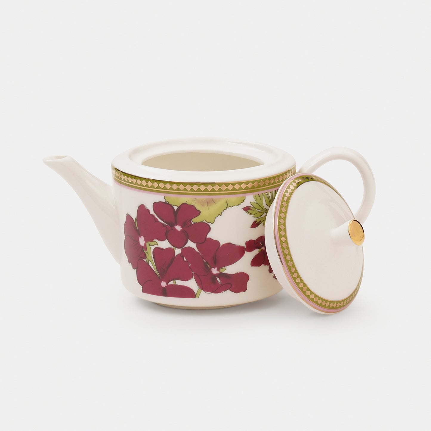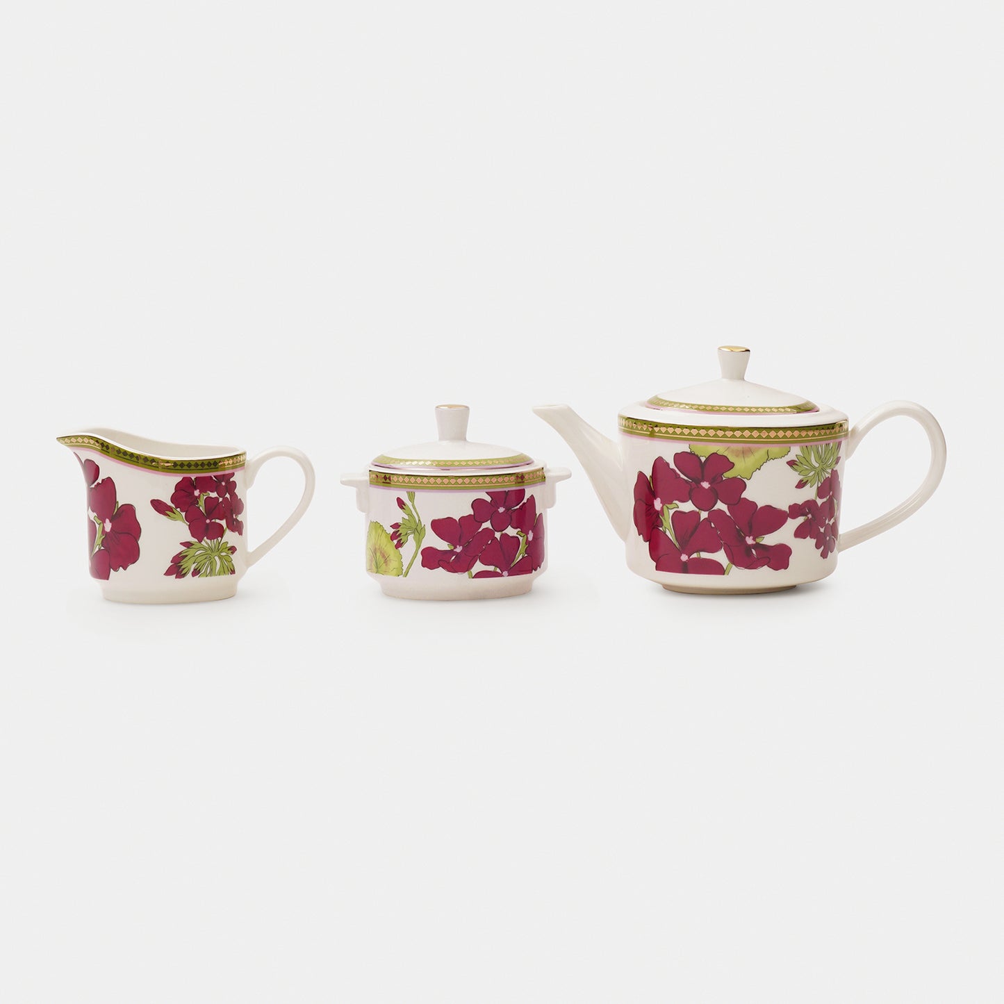 This red and green rosabay print tea pot, creamer and sugar pot features elegant floral designs with golden accents. A perfect blend of charm and sophistication for serving tea in style.