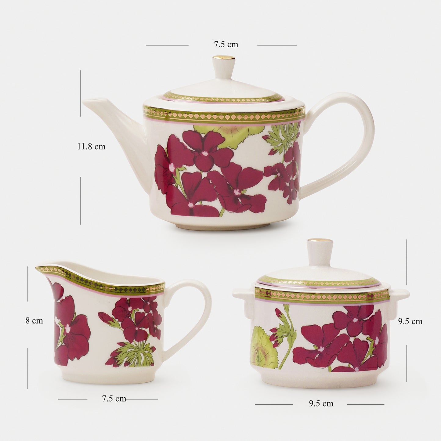 - Product Dimension: Tea Pot - 11.8X7.5CM Milk Pot - 8X7.5CM Sugar Pot - 9.5X9.5CM 650ML,290ML,320ML