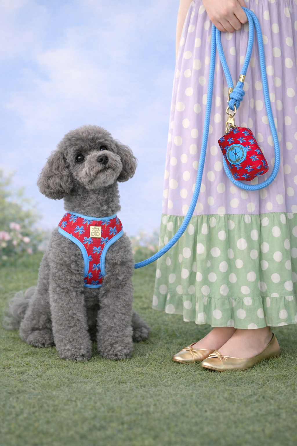 Includes an adjustable neoprene harness, rope leash and clip-on walk bag (with one roll of disposable waste bags included). Gold hardware throughout.